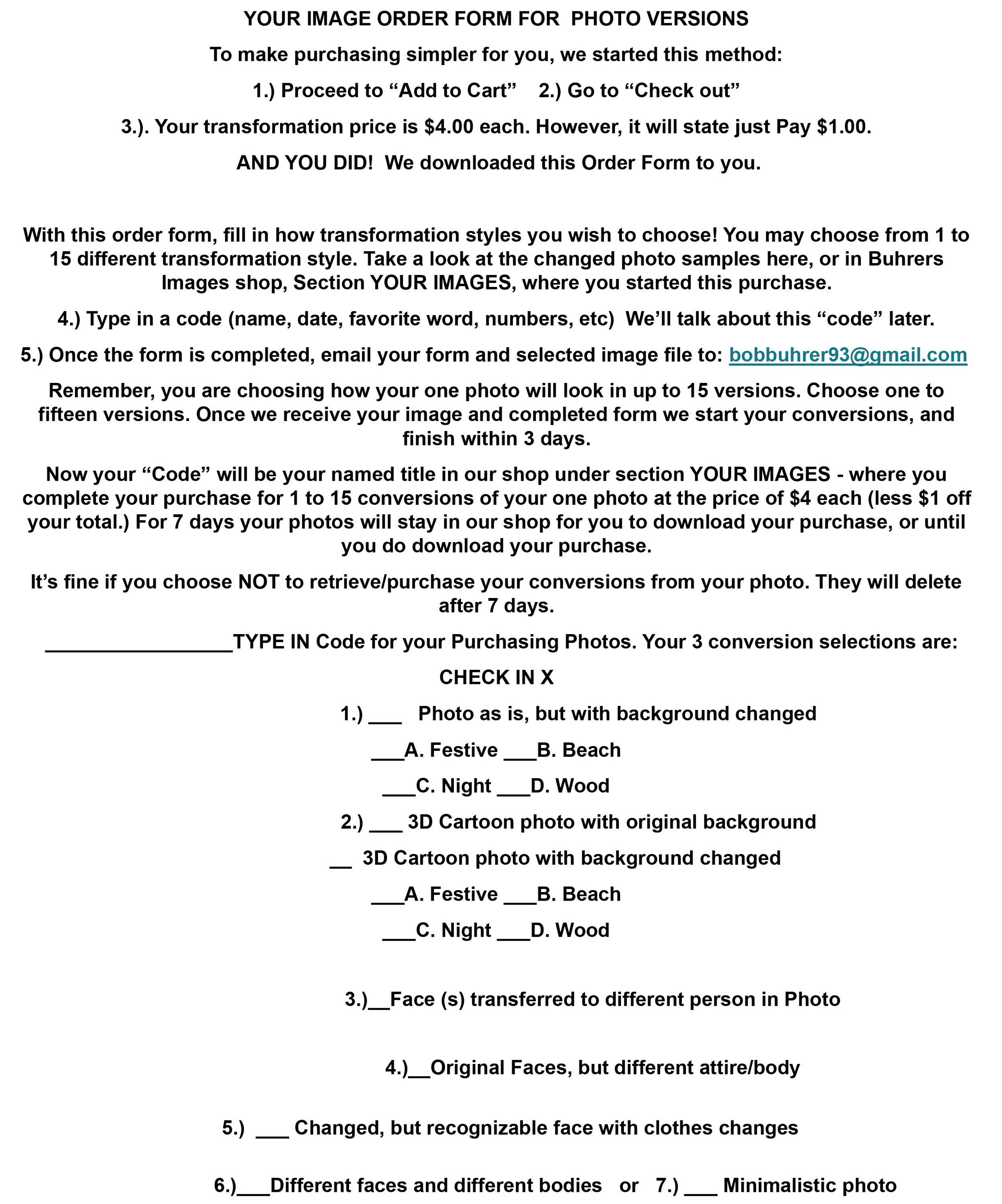 Your order form explains these procedures. Within 3 days or less, your selected conversions will upload to our Etsy shop, BuhrersImages. In the category, YOUR IMAGES, your order will be found in listings with the title you coded in order form. Click on it. Then you complete your purchase for 1 to 15 conversions of your one photo at the price of $4 each (less $1 off your total.) Once purchase is complete, your order of 1 to 15 photo changes will automatically download to your computer.